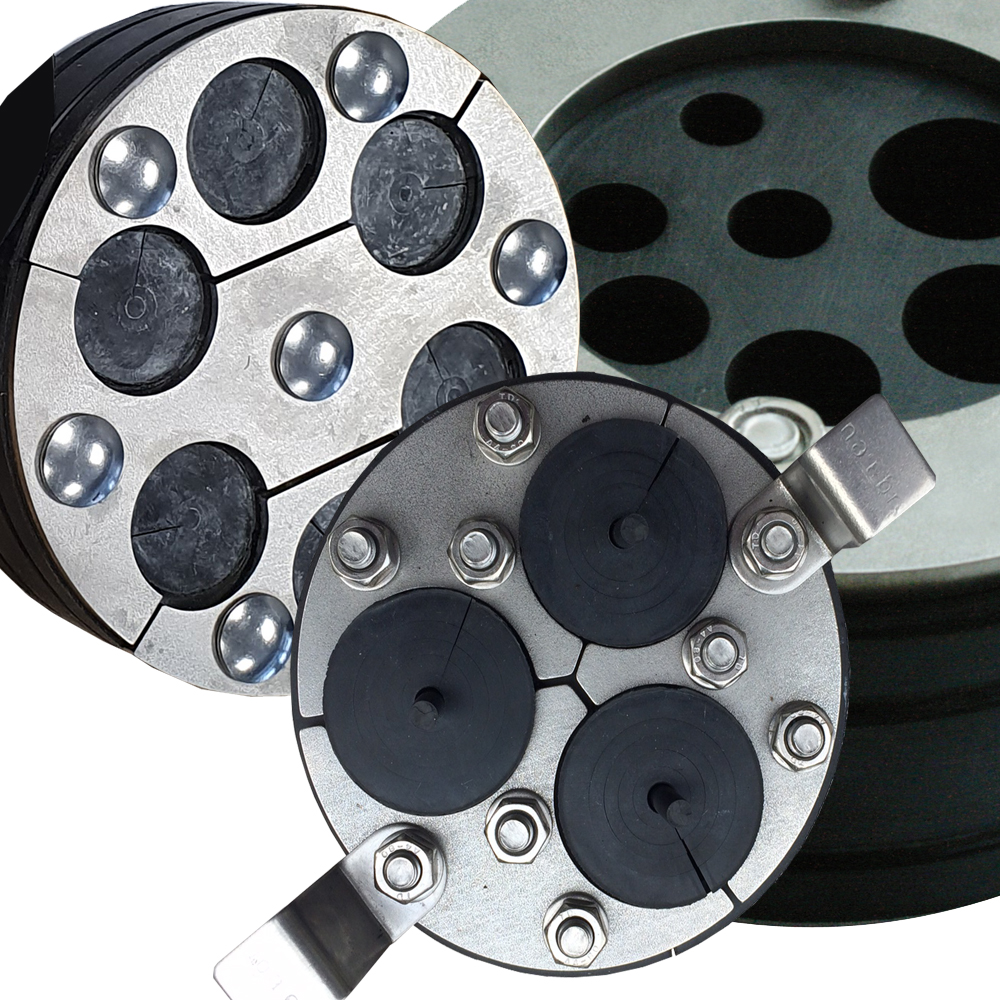 Die Abdichtung besteht aus hochwertigem EPDM-Kautschuk mit einer Shore-Härte von 43 ±5°. Dieses Material zeichnet sich durch seine hohe Elastizität, Alterungsbeständigkeit und Widerstandsfähigkeit gegenüber Umwelteinflüssen aus. Die integrierten Druckplatten aus rostfreiem V2A-Edelstahl sorgen für eine gleichmässige Pressung und gewährleisten eine dauerhaft sichere Abdichtung. Mit einer Gummidicke von 40 mm bietet das System eine besonders robuste und stabile Ausführung, die auch bei anspruchsvollen Einbausituationen zuverlässige Ergebnisse liefert.