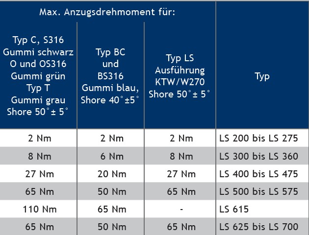 Ziehen Sie jede Schraube MAXIMAL 4 Umdrehungen an. Wiederholen Sie den Vorgang im Uhrzeigersinn ungefähr 2 bis 3 mal, bis das Elastomer gleichmässig zwischen allen Druckplatten hervorquillt und der ange-gebene Drehmoment (s. Tabelle) erreicht ist.